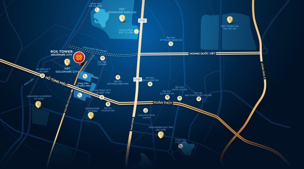 Vị trí Rox Center (RoxTower Goldmark City) tọa lạc trong khu C của dự án TNR Goldmark City, số 136 Hồ Tùng Mậu, Bắc Từ Liêm, Hà Nội, ngay giao lộ Nguyễn Cơ Thạch – Hoàng Quốc Việt kéo dài. Đây là tâm điểm kết nối vùng kinh tế năng động bậc nhất tại Thủ Đô, dễ dàng kết nối nhanh tới các siêu hạ tầng: metro số 3, sân bay Nội Bài, Bến xe Mỹ Đình và Tây Hồ Tây. Bên cạnh đó, vị trí tòa nhà cũng là khu vực có mật độ dân cư cao và nhiều hoạt động thương mại diễn ra sôi động, tạo điều kiện cho các doanh nghiệp hoạt động và phát triển lâu dài.